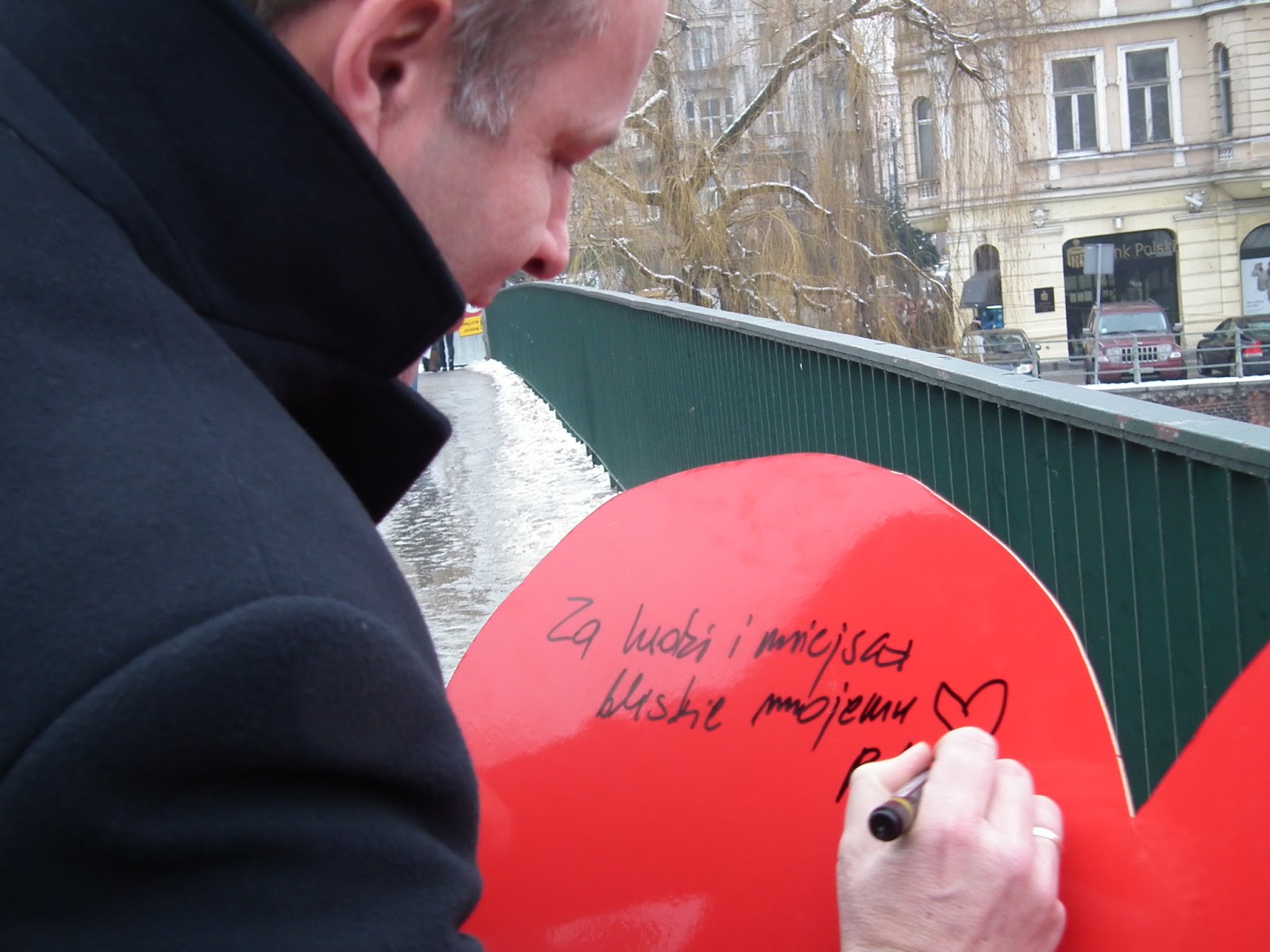 mieszkańcy mogli napisać za co kochają Bydgoszcz. Dobry przykład dał Prezydent Bydgoszczy Rafał Bruski, dokonując pierwszego wpisu i zachęcając przechodniów  do wyrażania swych uczuć dla miasta.